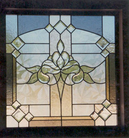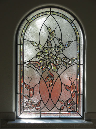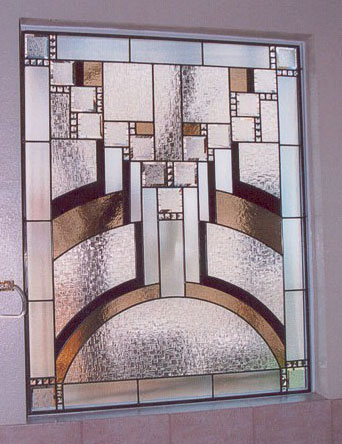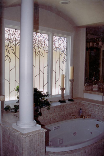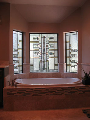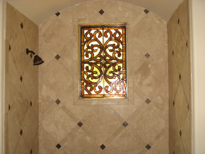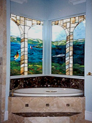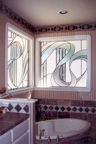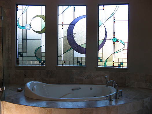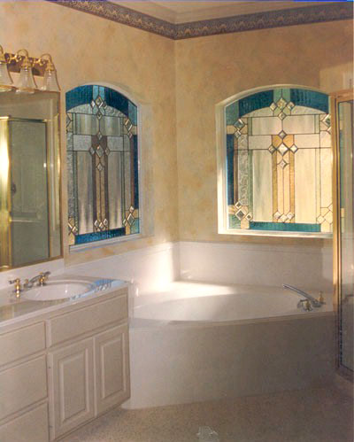 Art glass or stained glass in the master bath can be used to ensure privacy or obscure an unattractive exterior view while still allowing light to flow into your bath area. Stained glass can be colorful or have no color at all. Colorless glass comes in many textures which can be used to obscure visability or be used to obscure a partial view. For example, use art glass for the bottom half of a window and allow you to enjoy the view from the upper portion of the window. Why use glass block when you can enjoy a beautiful installation of art glass instead! |